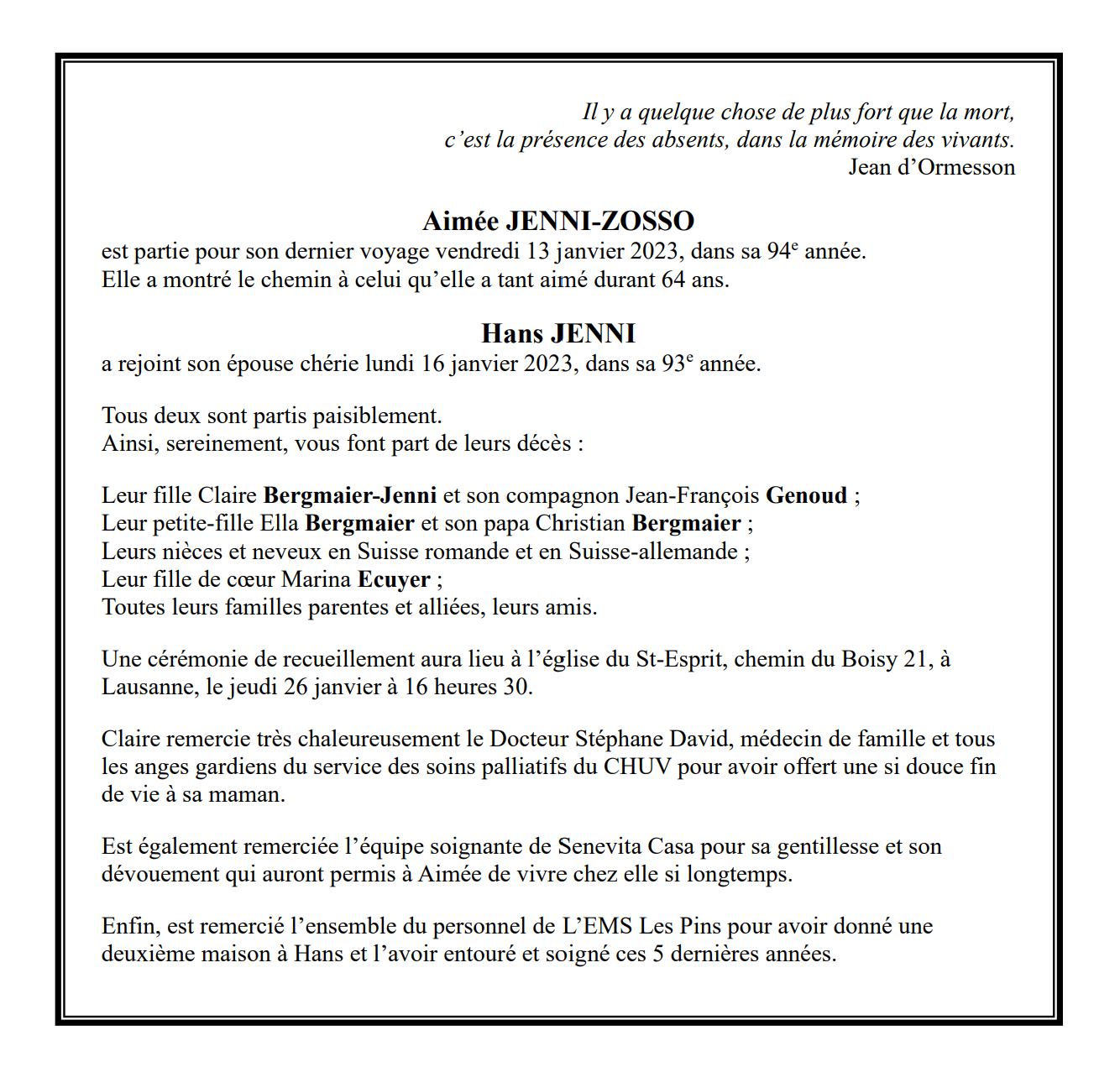 Aimée JENNI-ZOSSO 30 oct. 1929 - 13 jan. 2023 Avis mortuaire PFG Télecharger PDF Partager sur: Galerie PreviousNext PreviousNext