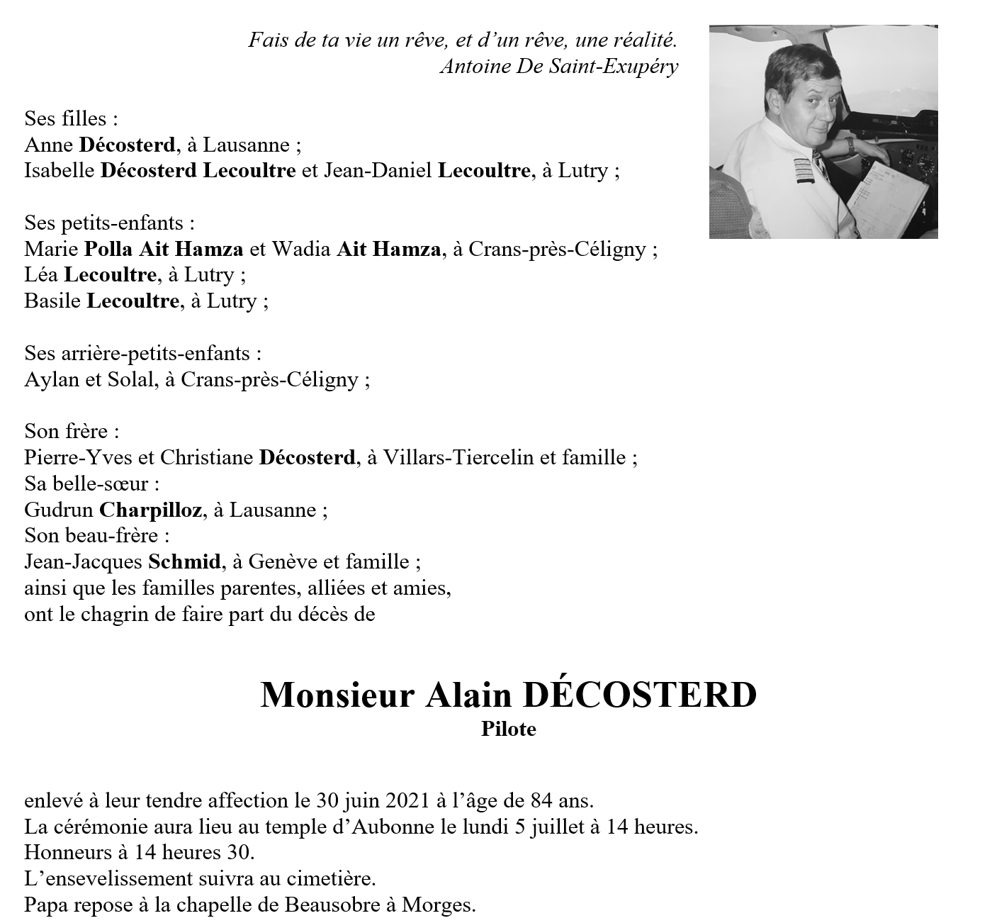 Alain DÉCOSTERD 17 mar. 1937 - 30 juin. 2021 Avis mortuaire PFG Télecharger PDF Partager sur: Galerie PreviousNext PreviousNext