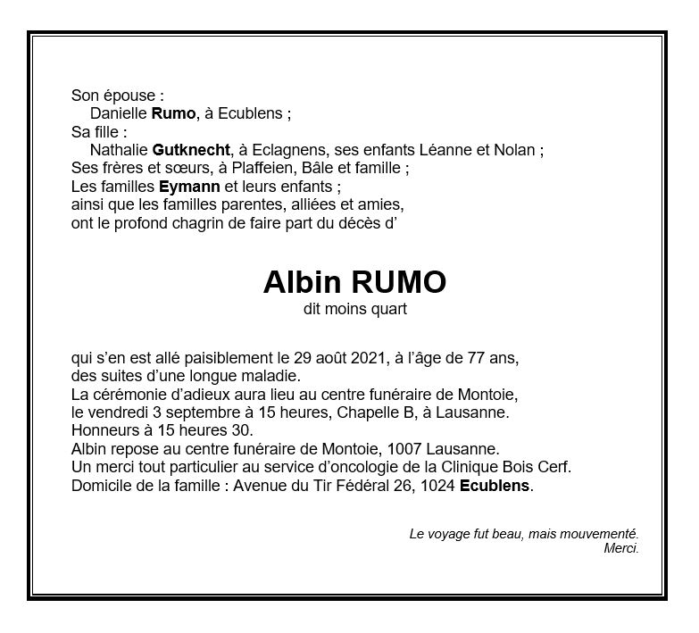 Albin RUMO 28 fév. 1944 - 29 aoû. 2021 Avis mortuaire PFG Télecharger PDF Partager sur: Galerie PreviousNext PreviousNext