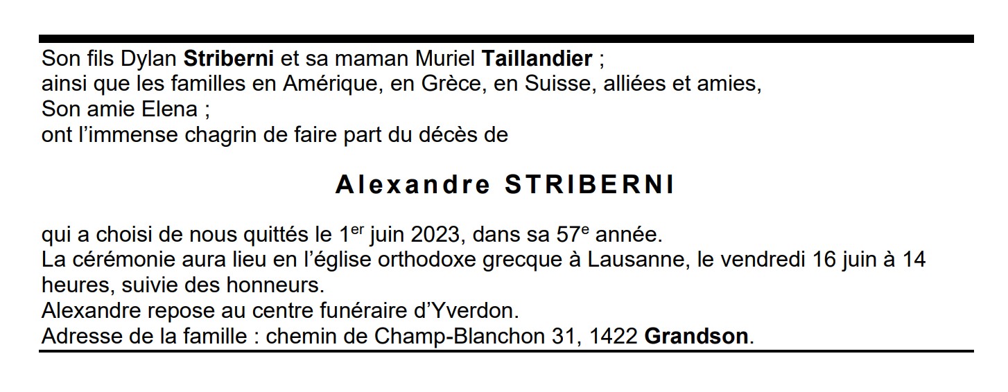 Alexandre STRIBERNI 20 juil. 1966 - 01 juin. 2023 Avis mortuaire PFG Télecharger PDF Partager sur: Galerie PreviousNext PreviousNext