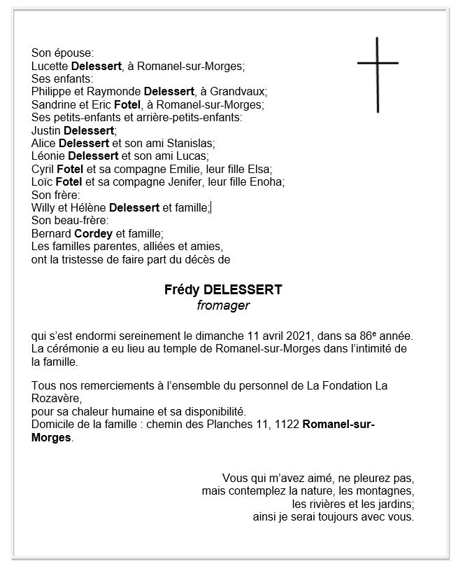 Alfred DELESSERT 10 oct. 1935 - 11 avr. 2021 Avis mortuaire PFG Télecharger PDF Partager sur: Galerie PreviousNext PreviousNext