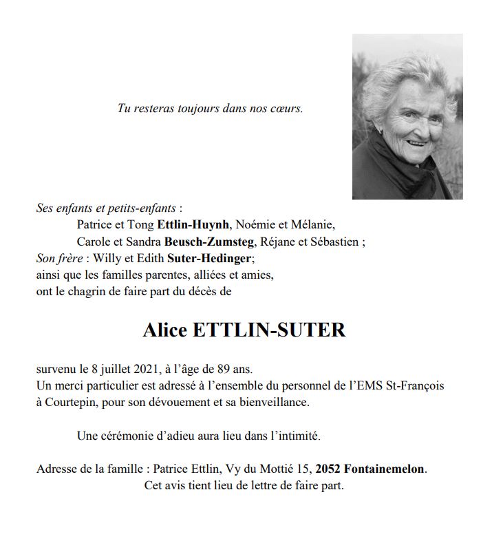 Alice ETTLIN-SUTER 01 mai. 1932 - 08 juil. 2021 Avis mortuaire PFG Télecharger PDF Partager sur: Galerie PreviousNext PreviousNext