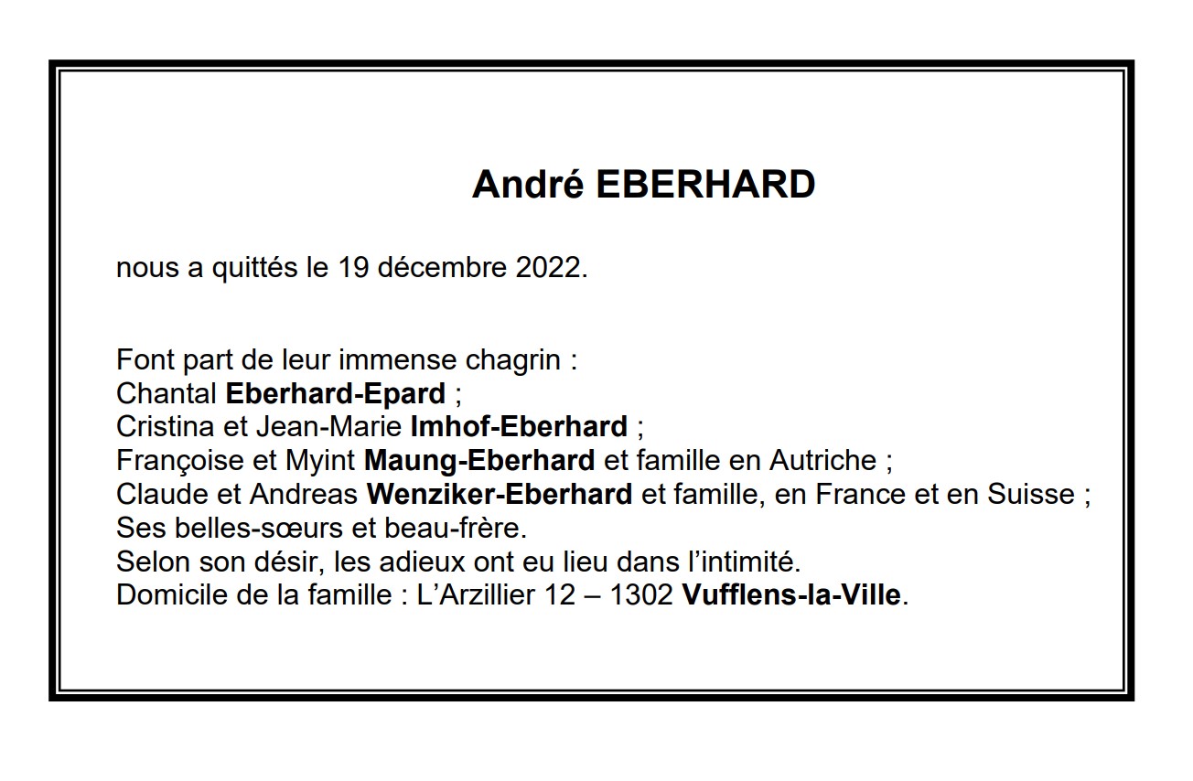André EBERHARD 05 fév. 1945 - 19 déc. 2022 Avis mortuaire PFG Télecharger PDF Partager sur: Galerie PreviousNext PreviousNext