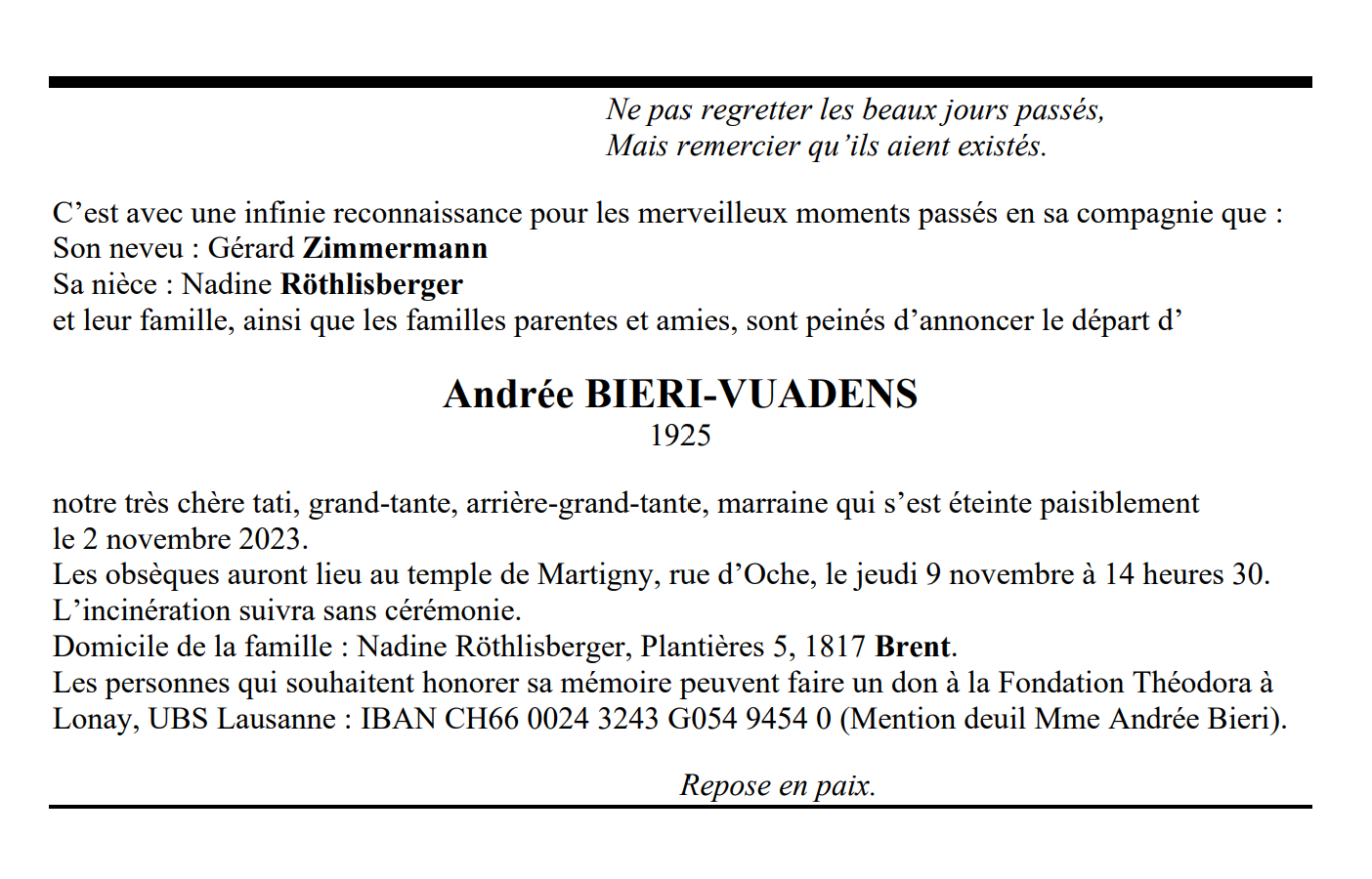 Andrée BIERI-VUADENS 22 oct. 1925 - 02 nov. 2023 Avis mortuaire PFG Télecharger PDF Partager sur: Galerie PreviousNext PreviousNext