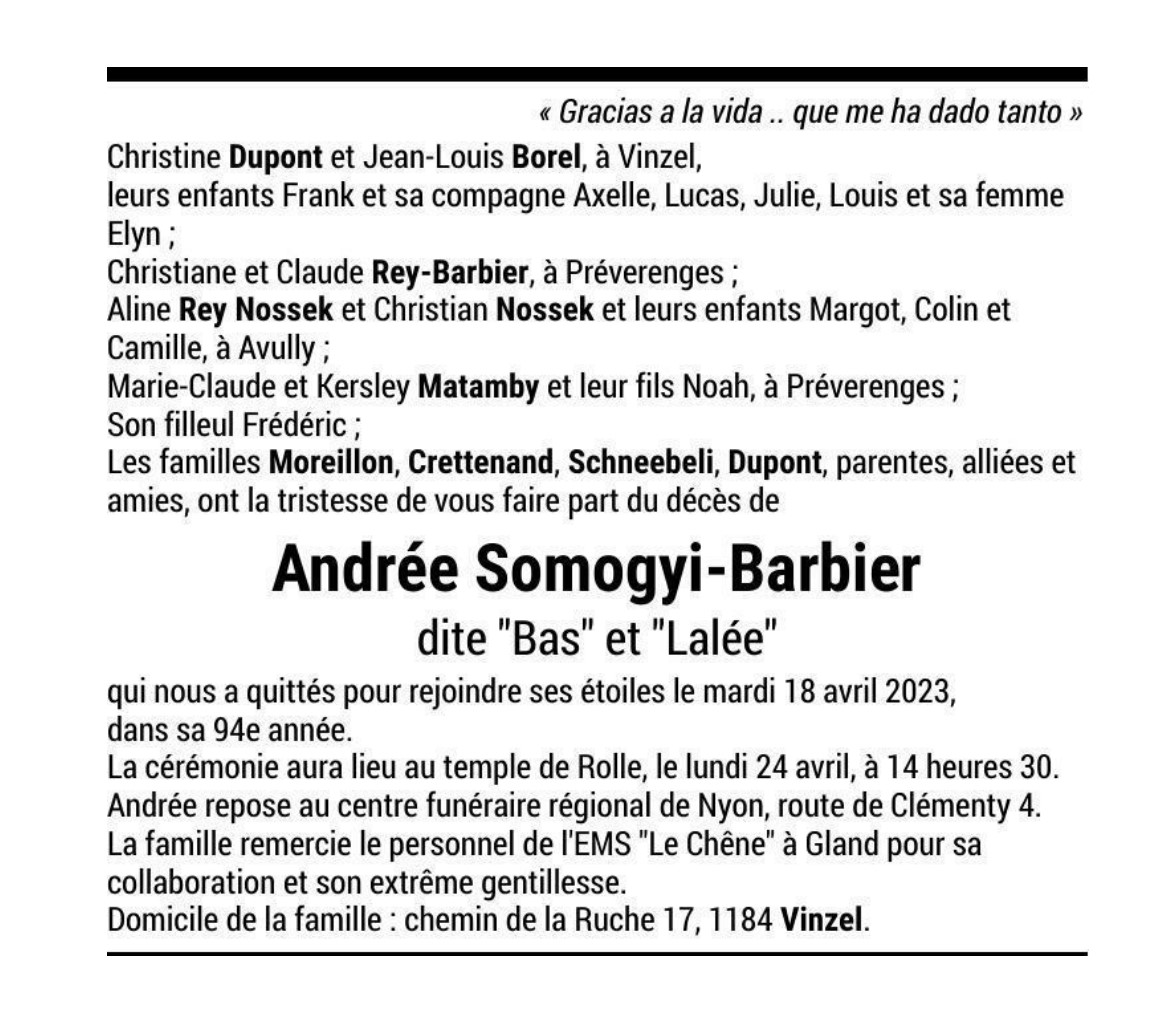Andrée Somogyi-Barbier dite "Bas" et "Lalée" 12 aoû. 1929 - 18 avr. 2023 Avis mortuaire PFG Télecharger PDF Partager sur: Galerie PreviousNext PreviousNext