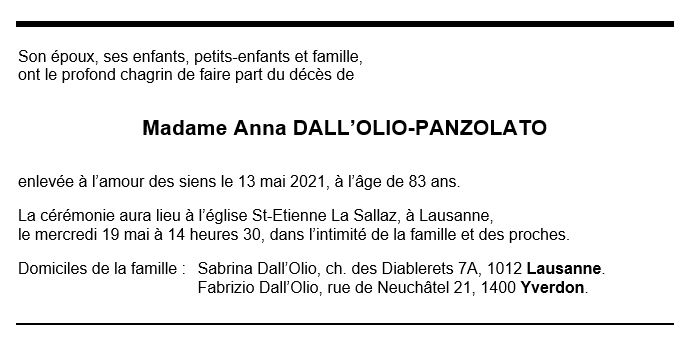 Anna DALL'OLIO-PANZOLATO 16 nov. 1937 - 13 mai. 2021 Avis mortuaire PFG Télecharger PDF Partager sur: Galerie PreviousNext PreviousNext