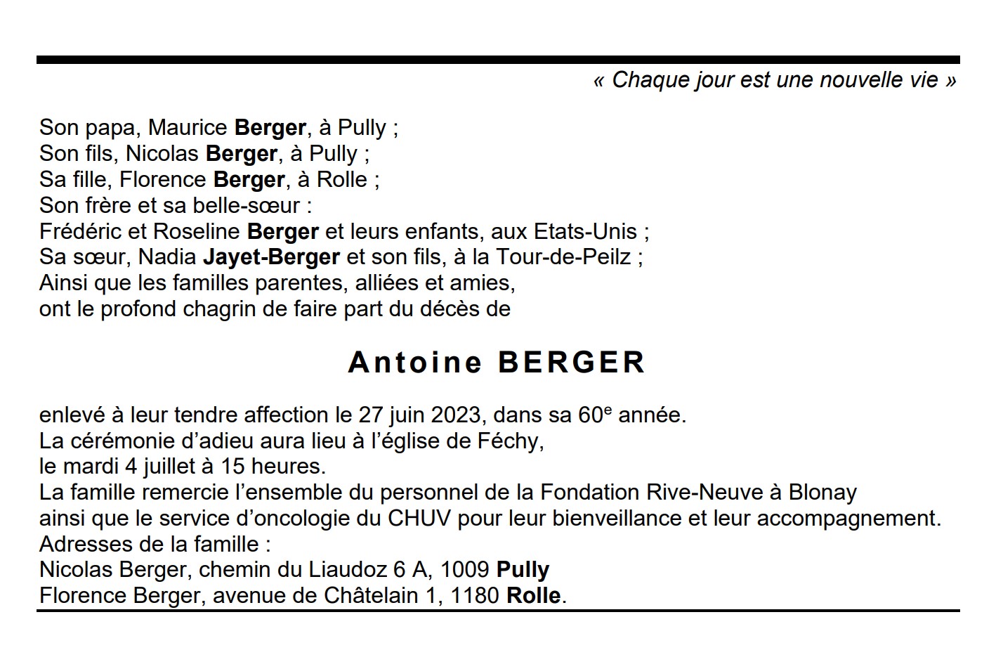 Antoine BERGER 04 nov. 1963 - 27 juin. 2023 Avis mortuaire PFG Télecharger PDF Partager sur: Galerie PreviousNext PreviousNext