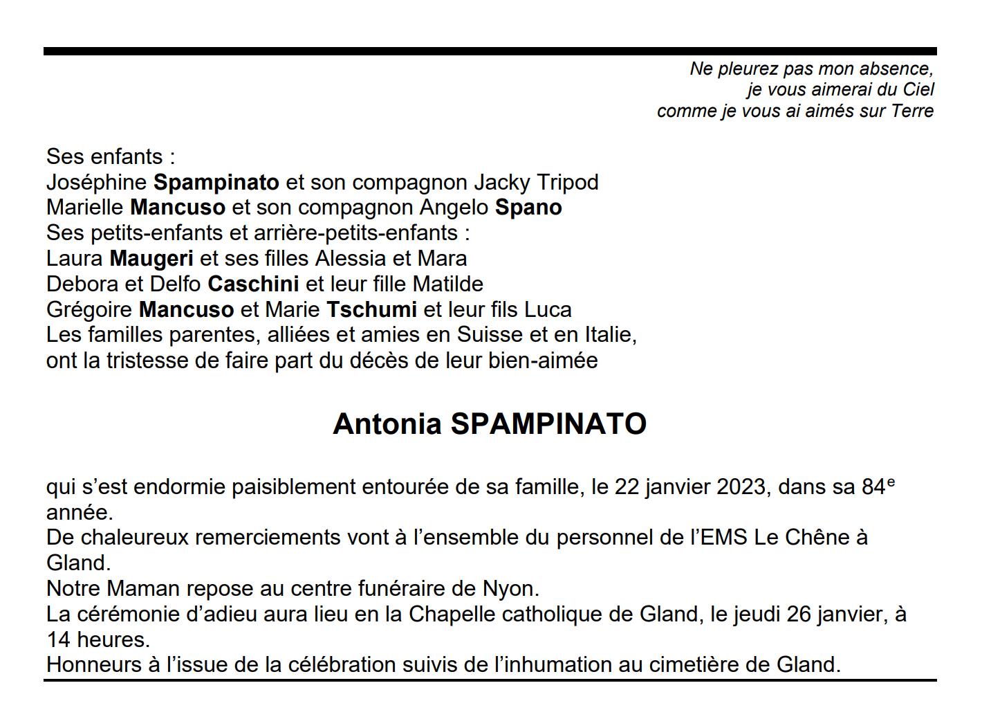 Antonia SPAMPINATO 18 fév. 1939 - 22 jan. 2023 Avis mortuaire PFG Télecharger PDF Partager sur: Galerie PreviousNext PreviousNext