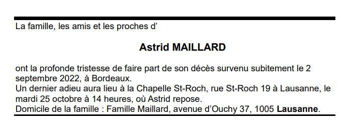 Astrid MAILLARD 18 jan. 1950 - 02 sep. 2022 Avis mortuaire PFG Télecharger PDF Partager sur: Galerie PreviousNext PreviousNext