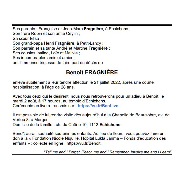 Benoît FRAGNIÈRE 05 jan. 1994 - 21 juil. 2022 Avis mortuaire PFG Télecharger PDF Partager sur: Galerie PreviousNext PreviousNext