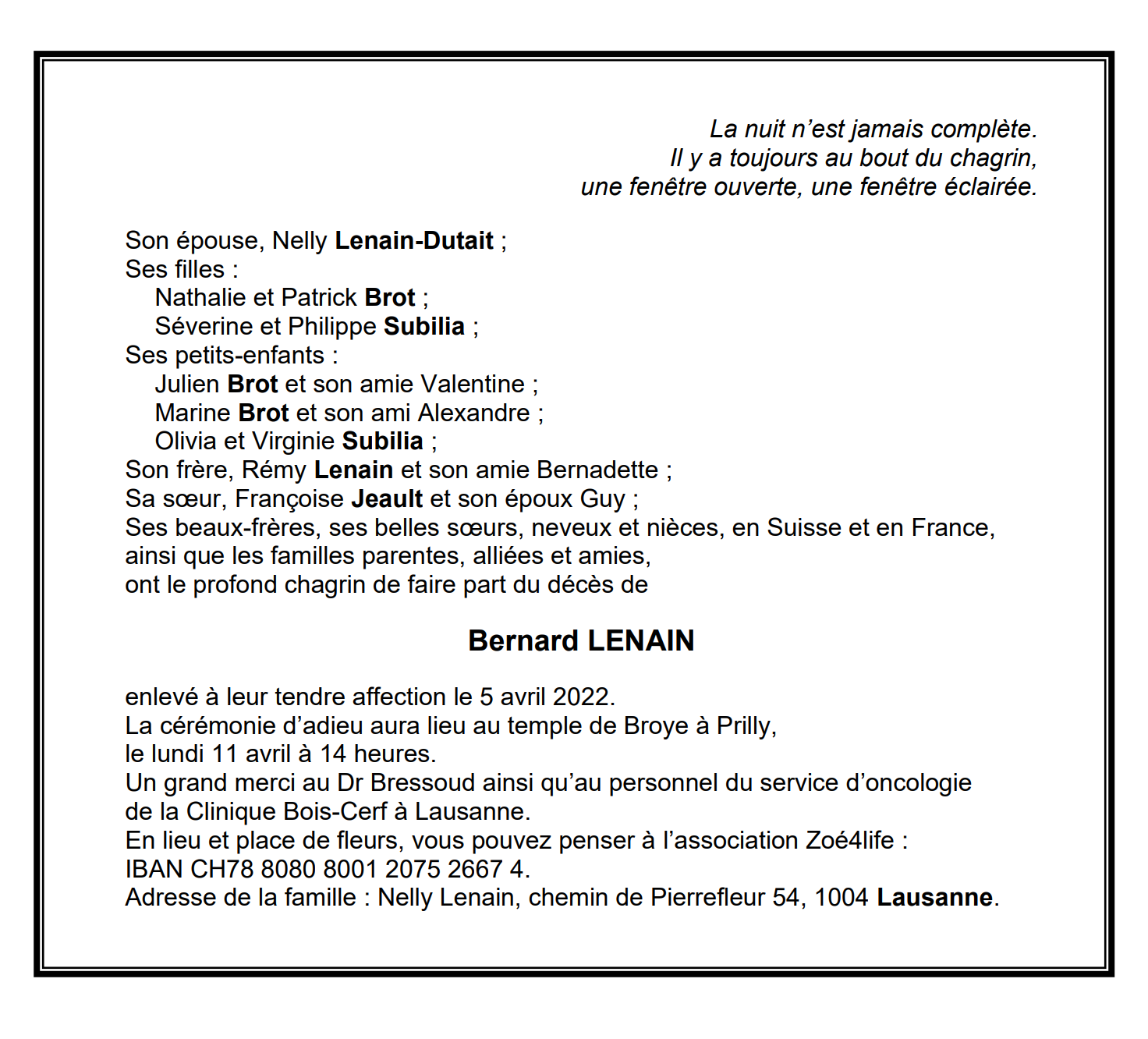 Bernard LENAIN 10 oct. 1940 - 05 avr. 2022 Avis mortuaire PFG Télecharger PDF Partager sur: Galerie PreviousNext PreviousNext