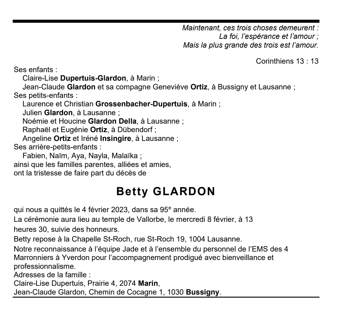 Betty GLARDON 19 mai. 1928 - 04 fév. 2023 Avis mortuaire PFG Télecharger PDF Partager sur: Galerie PreviousNext PreviousNext