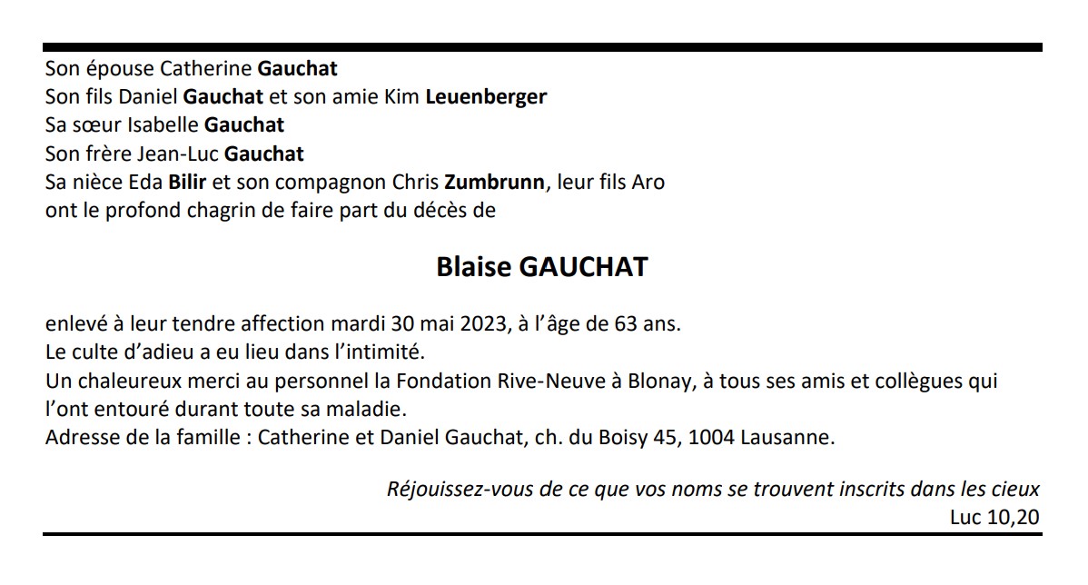 Blaise GAUCHAT 12 jan. 1960 - 30 mai. 2023 Avis mortuaire PFG Télecharger PDF Partager sur: Galerie PreviousNext PreviousNext
