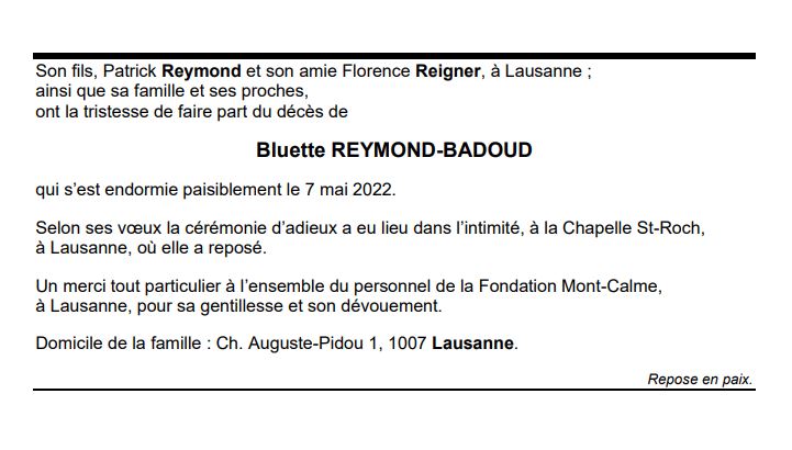 Bluette REYMOND-BADOUD 05 sep. 1930 - 07 mai. 2022 Avis mortuaire PFG Télecharger PDF Partager sur: Galerie PreviousNext PreviousNext