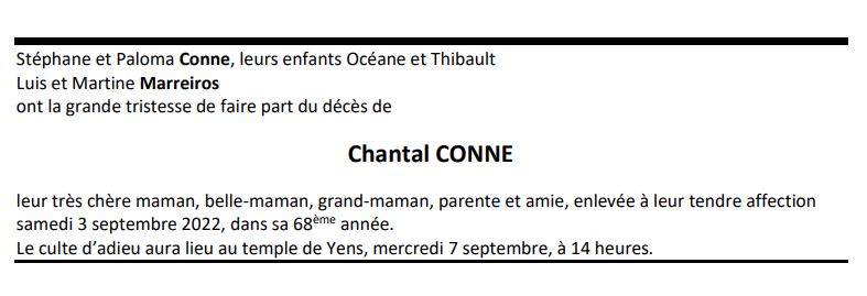 Chantal CONNE 22 sep. 1954 - 03 sep. 2022 Avis mortuaire PFG Télecharger PDF Partager sur: Galerie PreviousNext PreviousNext