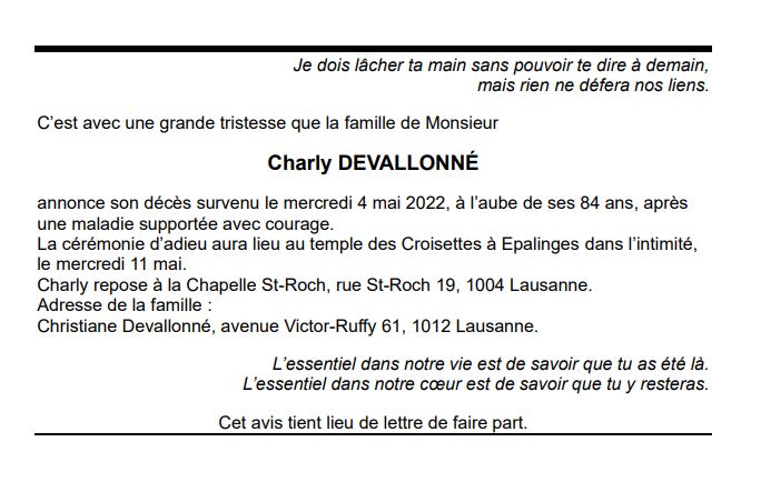 Charly DEVALLONNÉ 21 mai. 1938 - 04 mai. 2022 Avis mortuaire PFG Télecharger PDF Partager sur: Galerie PreviousNext PreviousNext