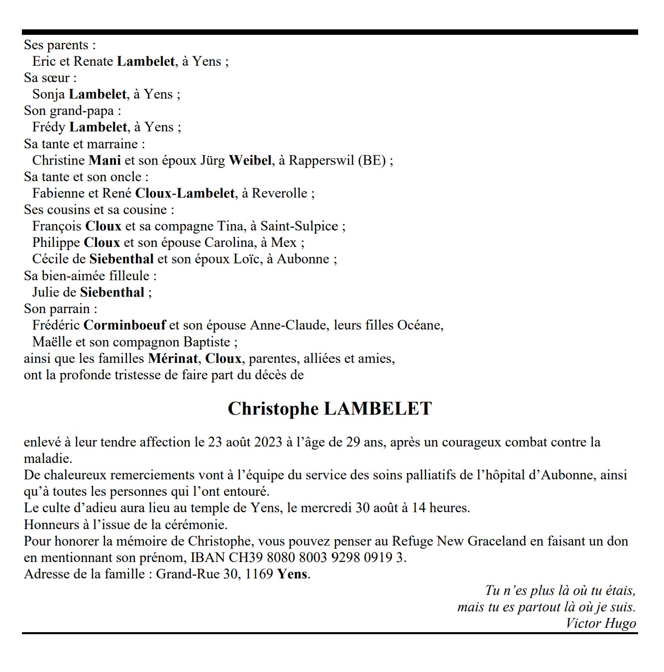 Christophe LAMBELET 18 mar. 1994 - 23 aoû. 2023 Avis mortuaire PFG Télecharger PDF Partager sur: Galerie PreviousNext PreviousNext