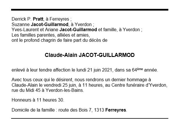 Claude-Alain JACOT-GUILLARMOD 03 nov. 1957 - 21 juin. 2021 Avis mortuaire PFG Télecharger PDF Partager sur: Galerie PreviousNext PreviousNext