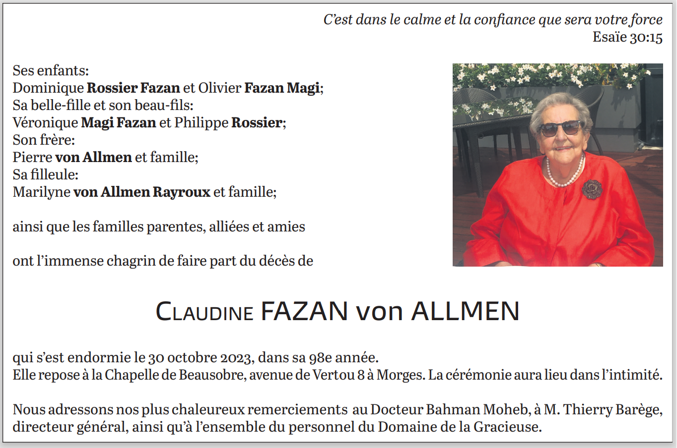 CLAUDINE FAZAN von ALLMEN 22 mar. 1926 - 30 oct. 2023 Avis mortuaire PFG Télecharger PDF Partager sur: Galerie PreviousNext PreviousNext