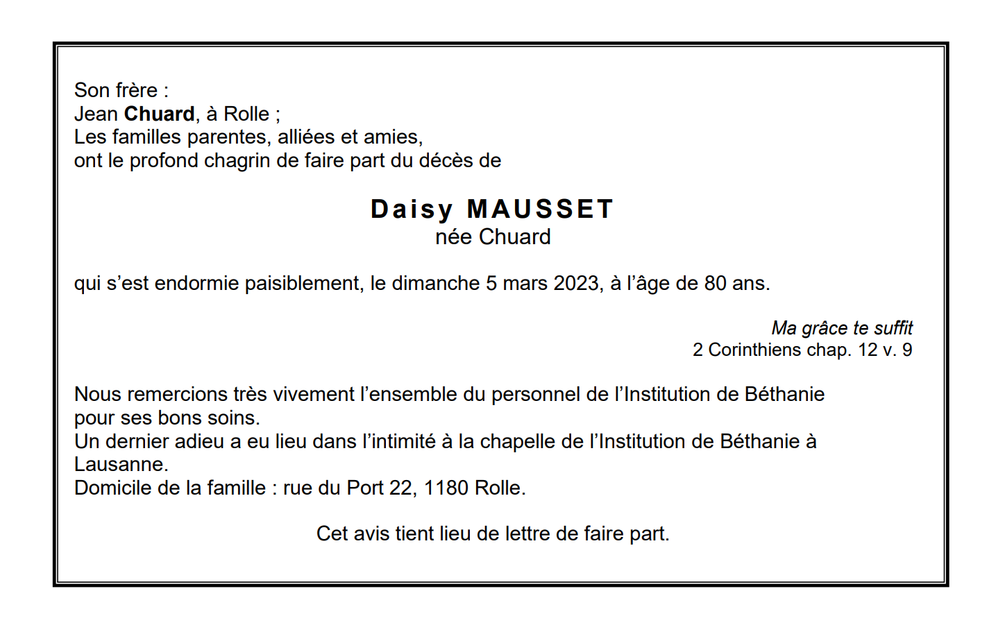 Daisy MAUSSET née Chuard 17 fév. 1943 - 05 mar. 2023 Avis mortuaire PFG Télecharger PDF Partager sur: Galerie