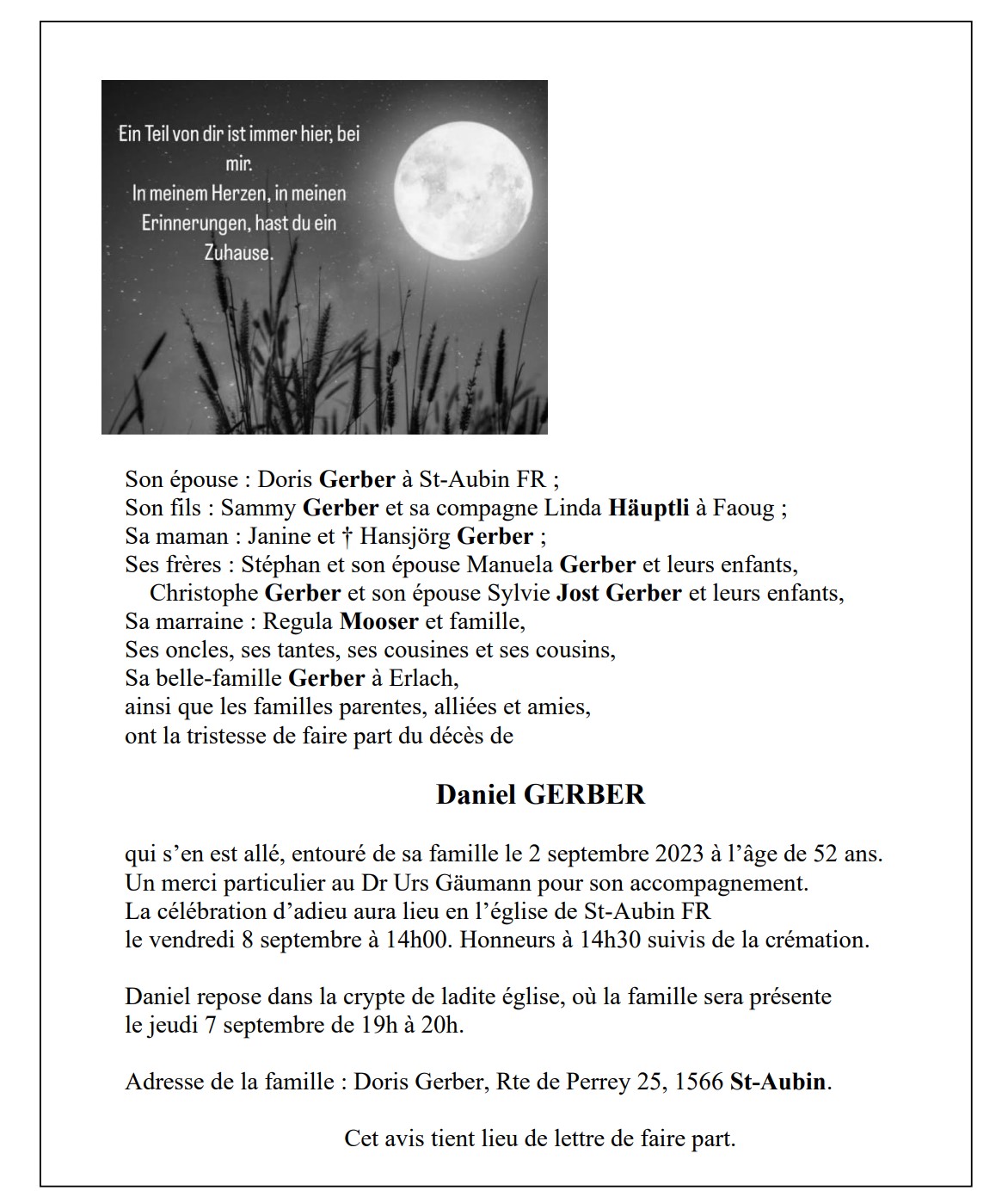 Daniel GERBER 19 fév. 1971 - 02 sep. 2023 Avis mortuaire PFG Télecharger PDF Partager sur: Galerie PreviousNext PreviousNext