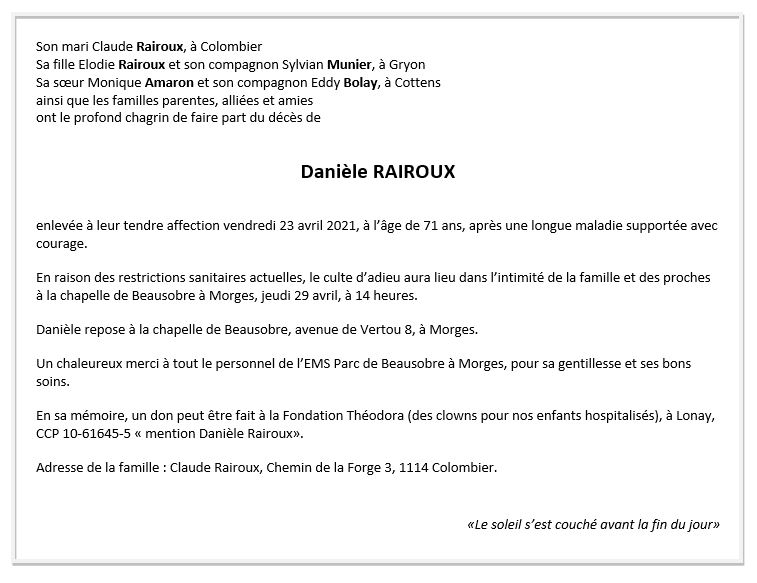Danièle RAIROUX 29 mar. 1950 - 23 avr. 2021 Avis mortuaire PFG Télecharger PDF Partager sur: Galerie PreviousNext PreviousNext