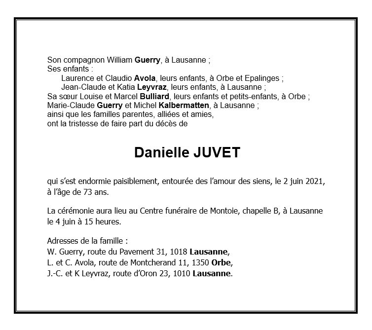 Danielle JUVET 03 fév. 1948 - 02 juin. 2021 Avis mortuaire PFG Télecharger PDF Partager sur: Galerie PreviousNext PreviousNext