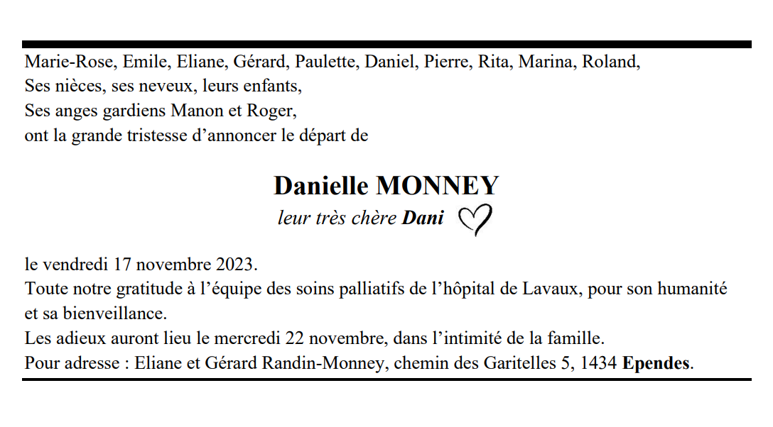 Danielle MONNEY leur très chère Dani 06 fév. 1948 - 17 nov. 2023 Avis mortuaire PFG Télecharger PDF Partager sur: Galerie PreviousNext PreviousNext