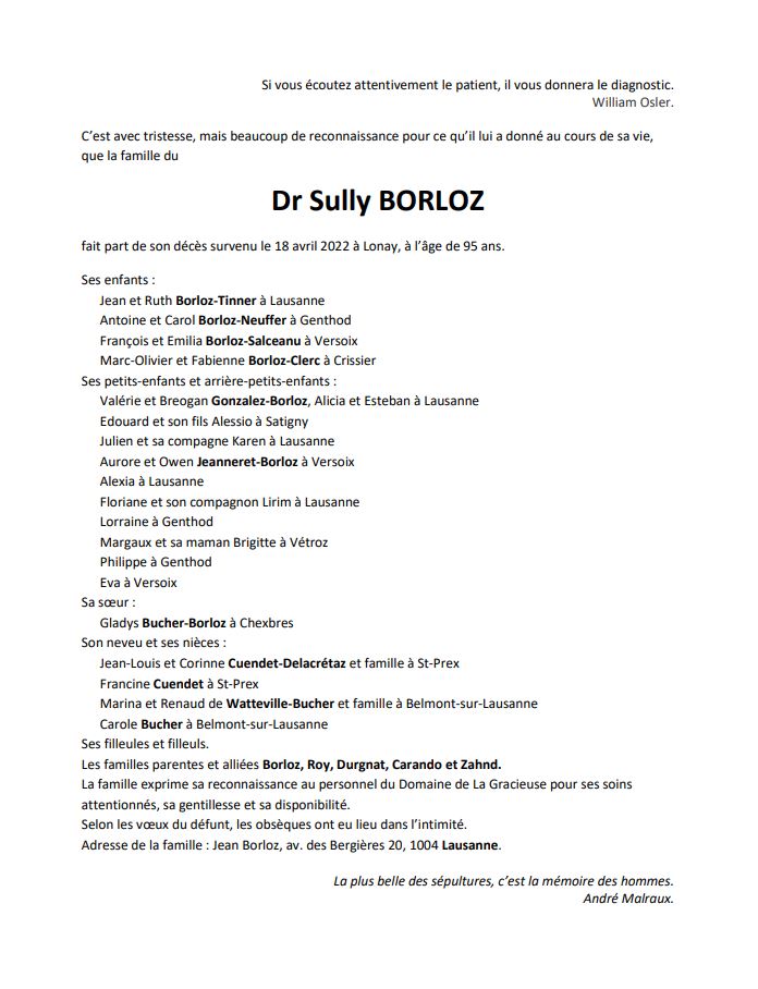 Dr Sully BORLOZ 07 avr. 1927 - 18 avr. 2022 Avis mortuaire PFG Télecharger PDF Partager sur: Galerie PreviousNext PreviousNext