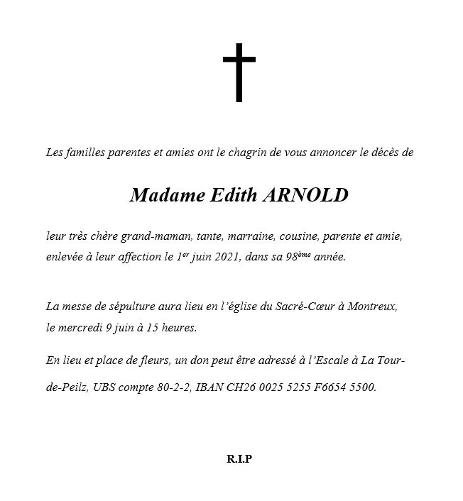 Edith ARNOLD 13 mai. 1924 - 01 juin. 2021 Avis mortuaire PFG Télecharger PDF Partager sur: Galerie PreviousNext PreviousNext
