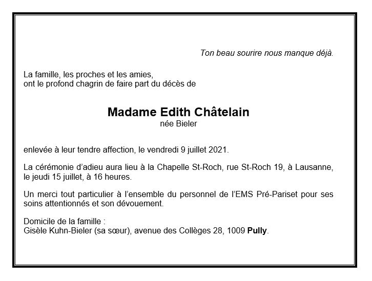 Edith CHÂTELAIN-BIELER 01 avr. 1925 - 09 juil. 2021 Avis mortuaire PFG Télecharger PDF Partager sur: Galerie PreviousNext PreviousNext