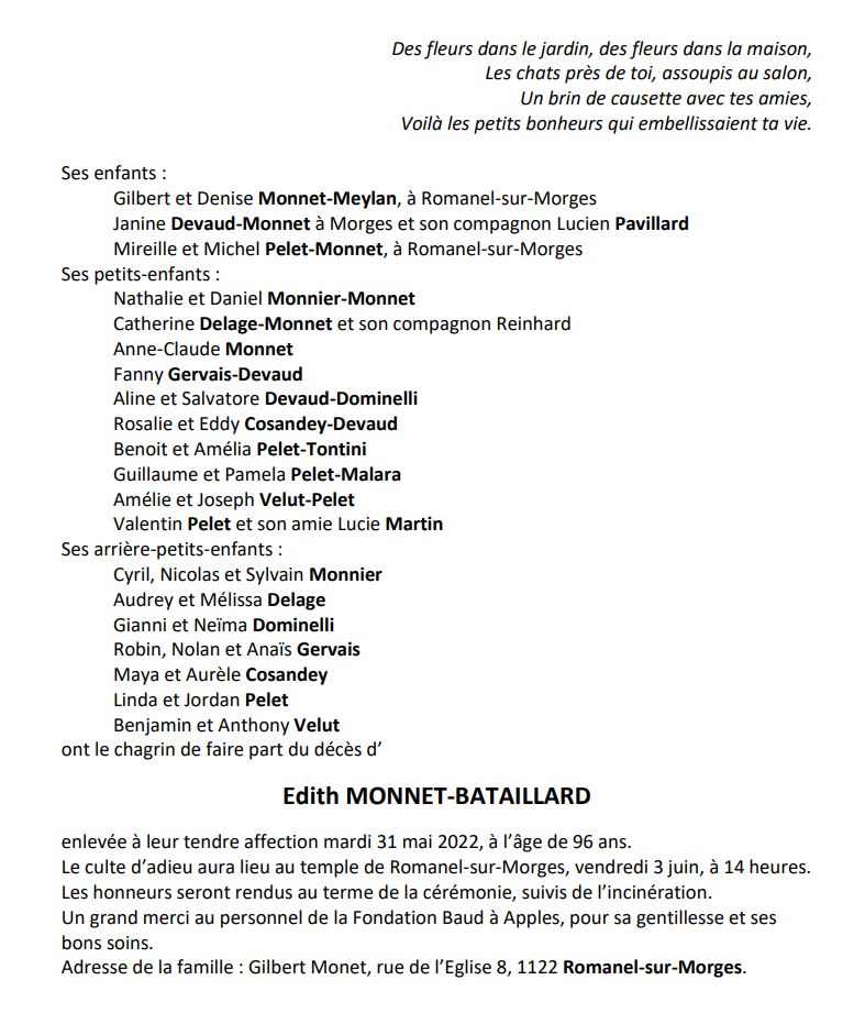 Edith MONNET-BATAILLARD 25 jan. 1926 - 31 mai. 2022 Avis mortuaire PFG Télecharger PDF Partager sur: Galerie PreviousNext PreviousNext
