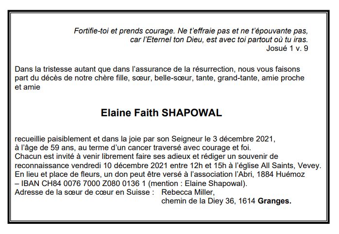 Elaine Faith SHAPOWAL 13 sep. 1962 - 03 déc. 2021 Avis mortuaire PFG Télecharger PDF Partager sur: Galerie PreviousNext PreviousNext