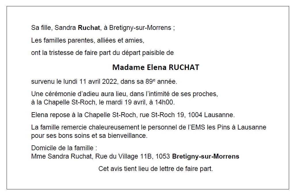 Elena RUCHAT 25 aoû. 1933 - 11 avr. 2022 Avis mortuaire PFG Télecharger PDF Partager sur: Galerie PreviousNext PreviousNext