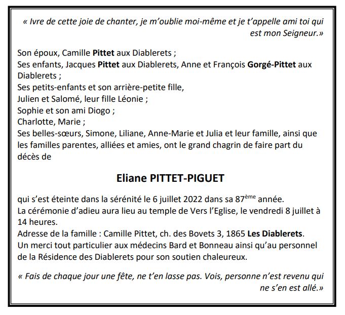 Eliane PITTET-PIGUET 07 aoû. 1935 - 06 juil. 2022 Avis mortuaire PFG Télecharger PDF Partager sur: Galerie PreviousNext PreviousNext