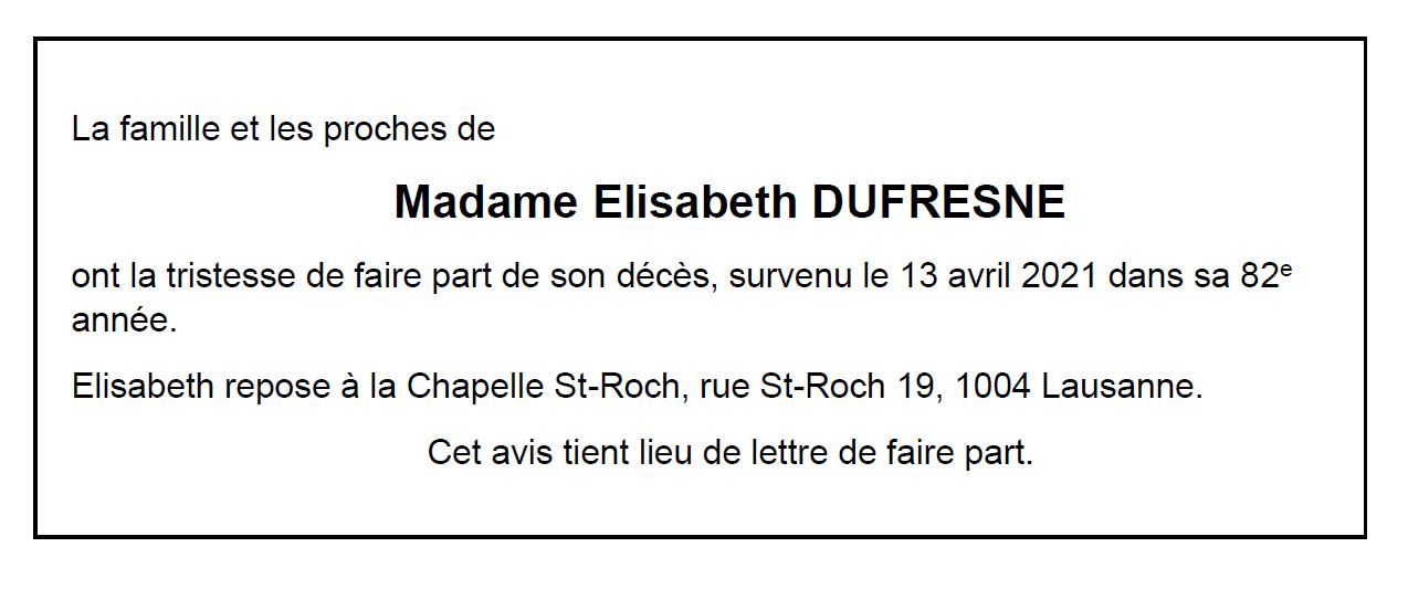 Elisabeth DUFRESNE 06 fév. 1940 - 13 avr. 2021 Avis mortuaire PFG Télecharger PDF Partager sur: Galerie PreviousNext PreviousNext
