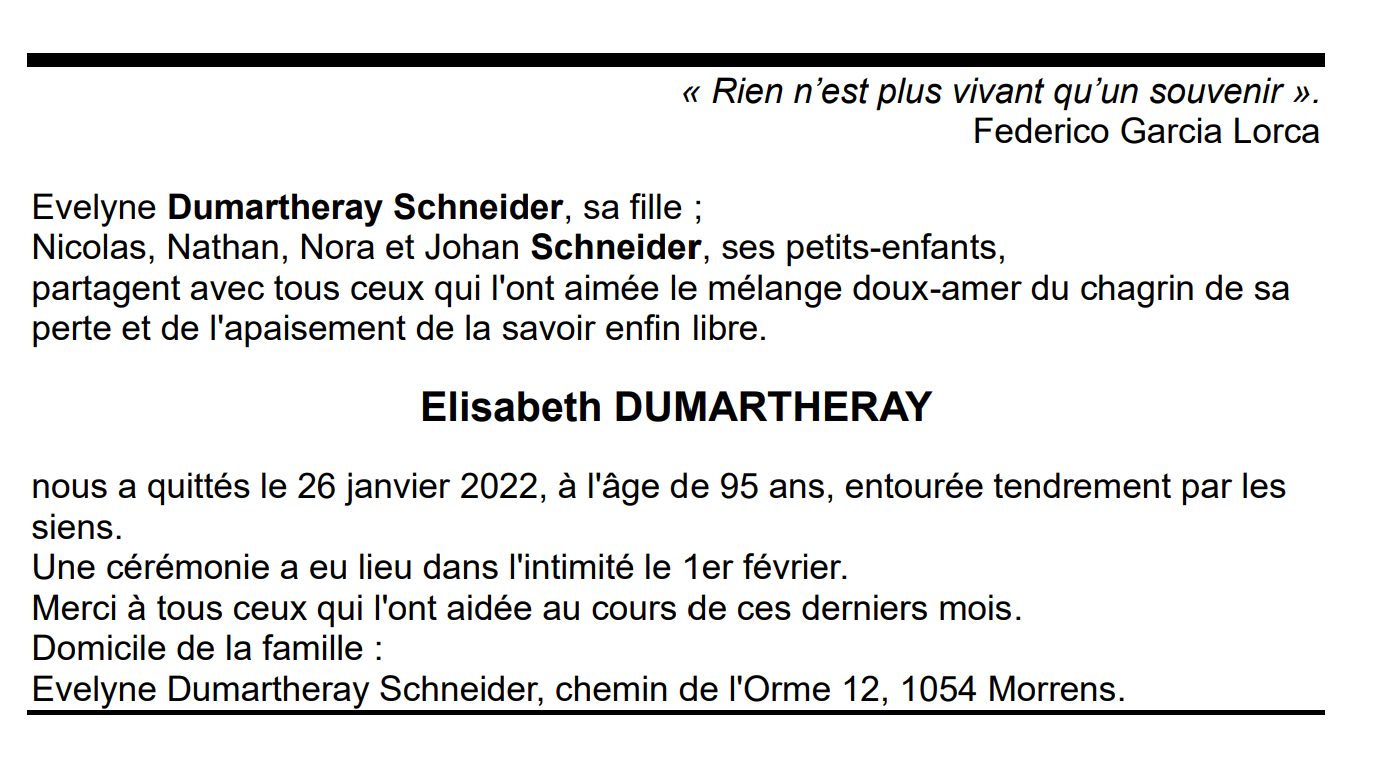 Elisabeth DUMARTHERAY 17 avr. 1926 - 26 jan. 2022 Avis mortuaire PFG Télecharger PDF Partager sur: Galerie PreviousNext PreviousNext