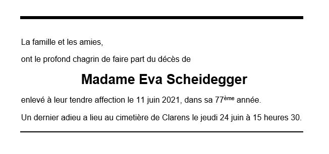 Eva SCHEIDEGGER 07 juin. 1944 - 11 juin. 2021 Avis mortuaire PFG Télecharger PDF Partager sur: Galerie PreviousNext PreviousNext