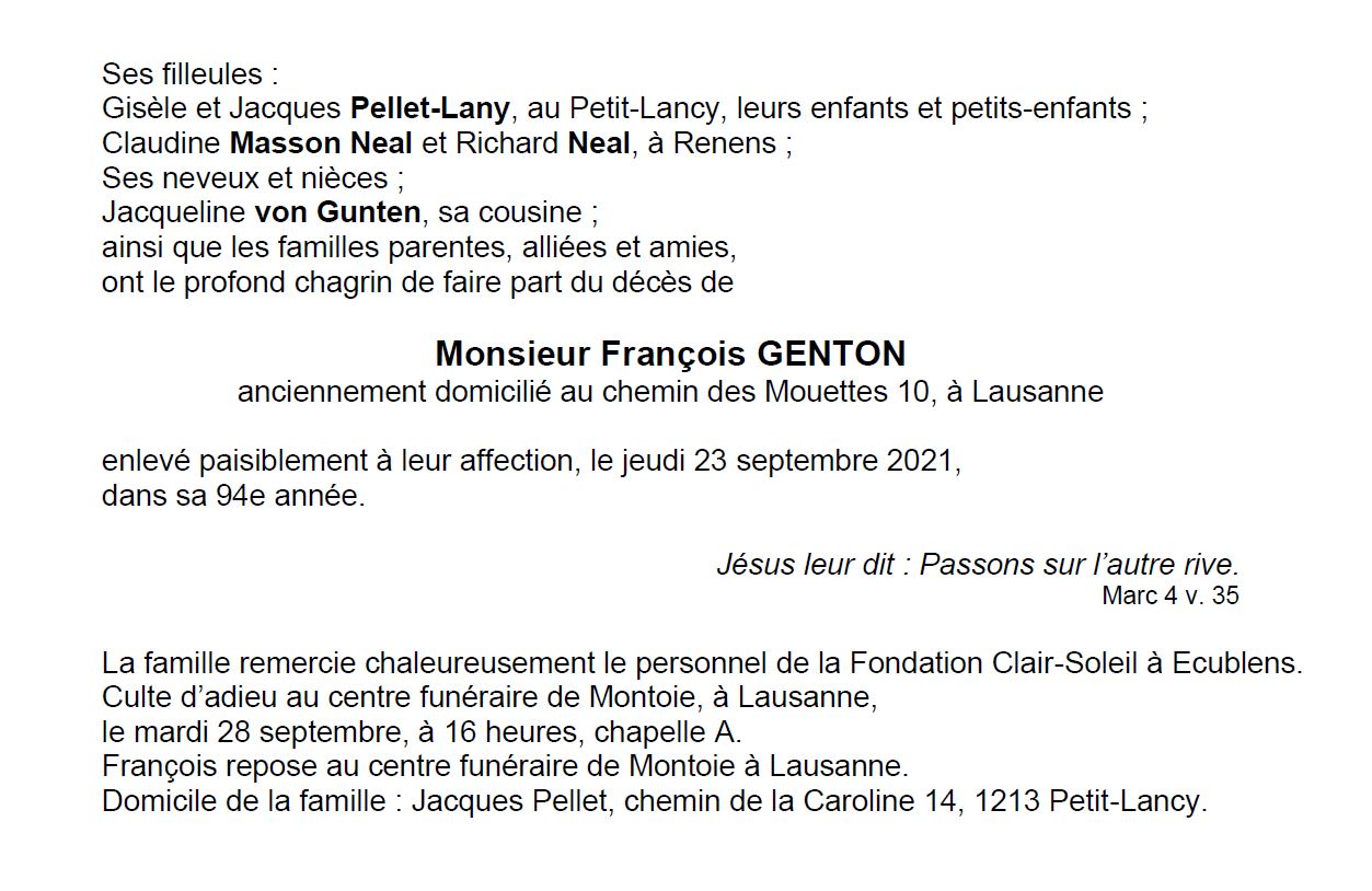 François GENTON 21 mar. 1928 - 23 sep. 2021 Avis mortuaire PFG Télecharger PDF Partager sur: Galerie PreviousNext PreviousNext