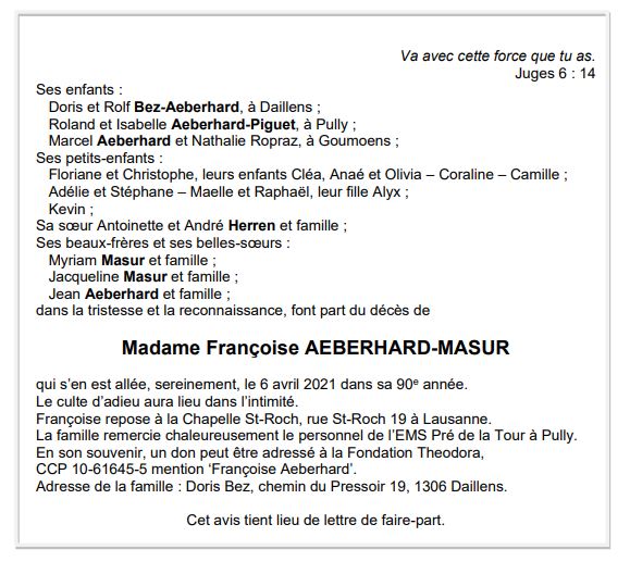 Françoise AEBERHARD-MASUR 22 mai. 1931 - 06 avr. 2021 Avis mortuaire PFG Télecharger PDF Partager sur: Galerie PreviousNext PreviousNext
