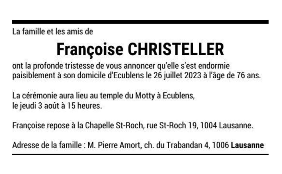 Françoise CHRISTELLER 13 avr. 1947 - 26 juil. 2023 Avis mortuaire PFG Télecharger PDF Partager sur: Galerie PreviousNext PreviousNext