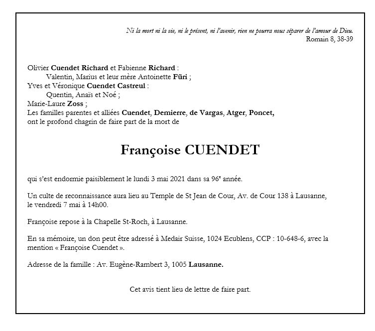Françoise CUENDET 02 oct. 1925 - 03 mai. 2021 Avis mortuaire PFG Télecharger PDF Partager sur: Galerie PreviousNext PreviousNext