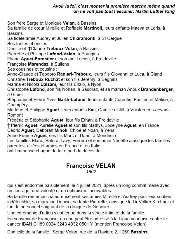 Françoise VELAN 11 juil. 1962 - 04 juil. 2021 Avis mortuaire PFG Télecharger PDF Partager sur: Galerie PreviousNext PreviousNext