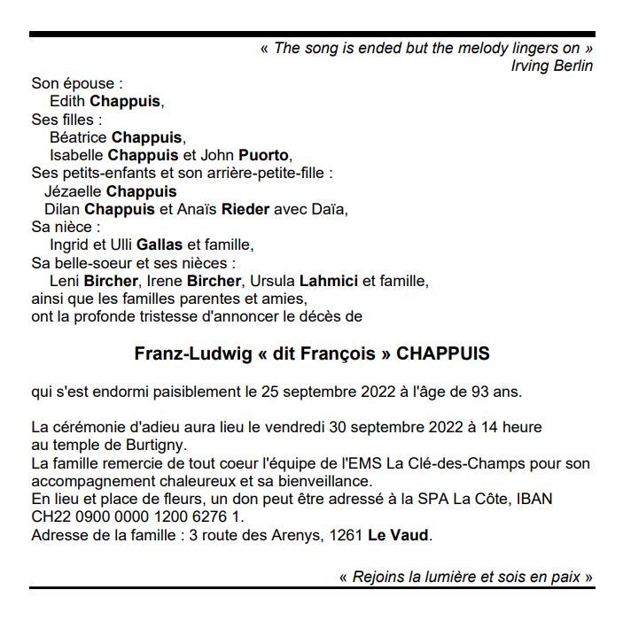 Franz-Ludwig « dit François » CHAPPUIS 05 jan. 1929 - 25 sep. 2022 Avis mortuaire PFG Télecharger PDF Partager sur: Galerie PreviousNext PreviousNext