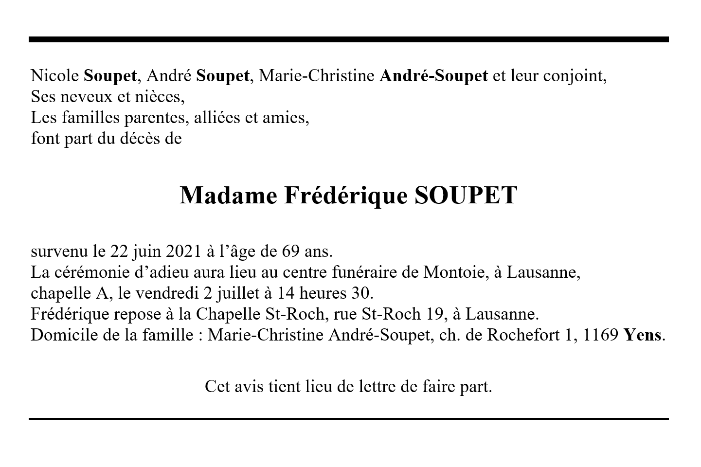 Frédérique SOUPET 12 mar. 1952 - 22 juin. 2021 Avis mortuaire PFG Télecharger PDF Partager sur: Galerie PreviousNext PreviousNext