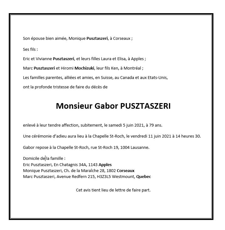 Gabor PUSZTASZERI 04 juin. 1942 - 05 juin. 2021 Avis mortuaire PFG Télecharger PDF Partager sur: Galerie PreviousNext PreviousNext