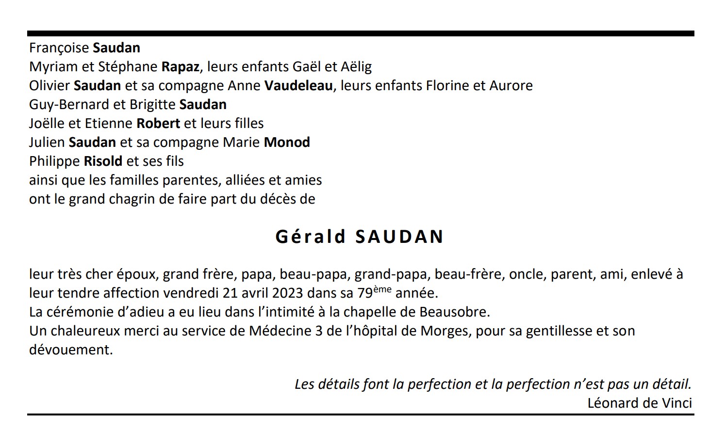 Gérald SAUDAN 29 mai. 1944 - 21 avr. 2023 Avis mortuaire PFG Télecharger PDF Partager sur: Galerie PreviousNext PreviousNext