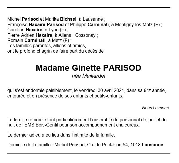 Ginette PARISOD 01 sep. 1927 - 30 avr. 2021 Avis mortuaire PFG Télecharger PDF Partager sur: Galerie PreviousNext PreviousNext