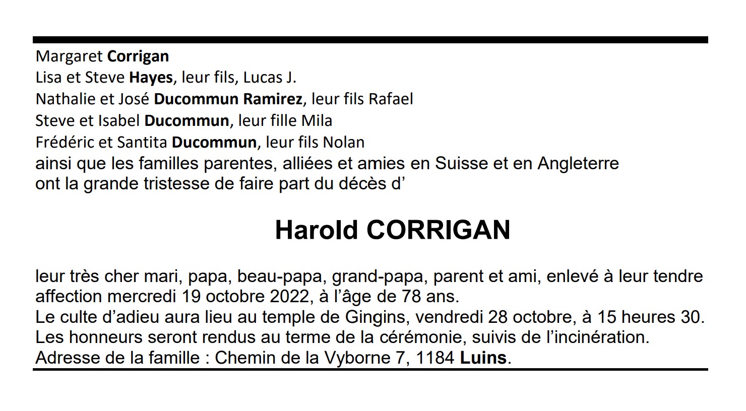 Harold CORRIGAN 04 sep. 1944 - 19 oct. 2022 Avis mortuaire PFG Télecharger PDF Partager sur: Galerie PreviousNext PreviousNext