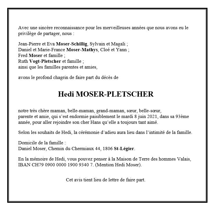 Hedi MOSER-PLETSCHER 27 jan. 1929 - 08 juin. 2021 Avis mortuaire PFG Télecharger PDF Partager sur: Galerie PreviousNext PreviousNext
